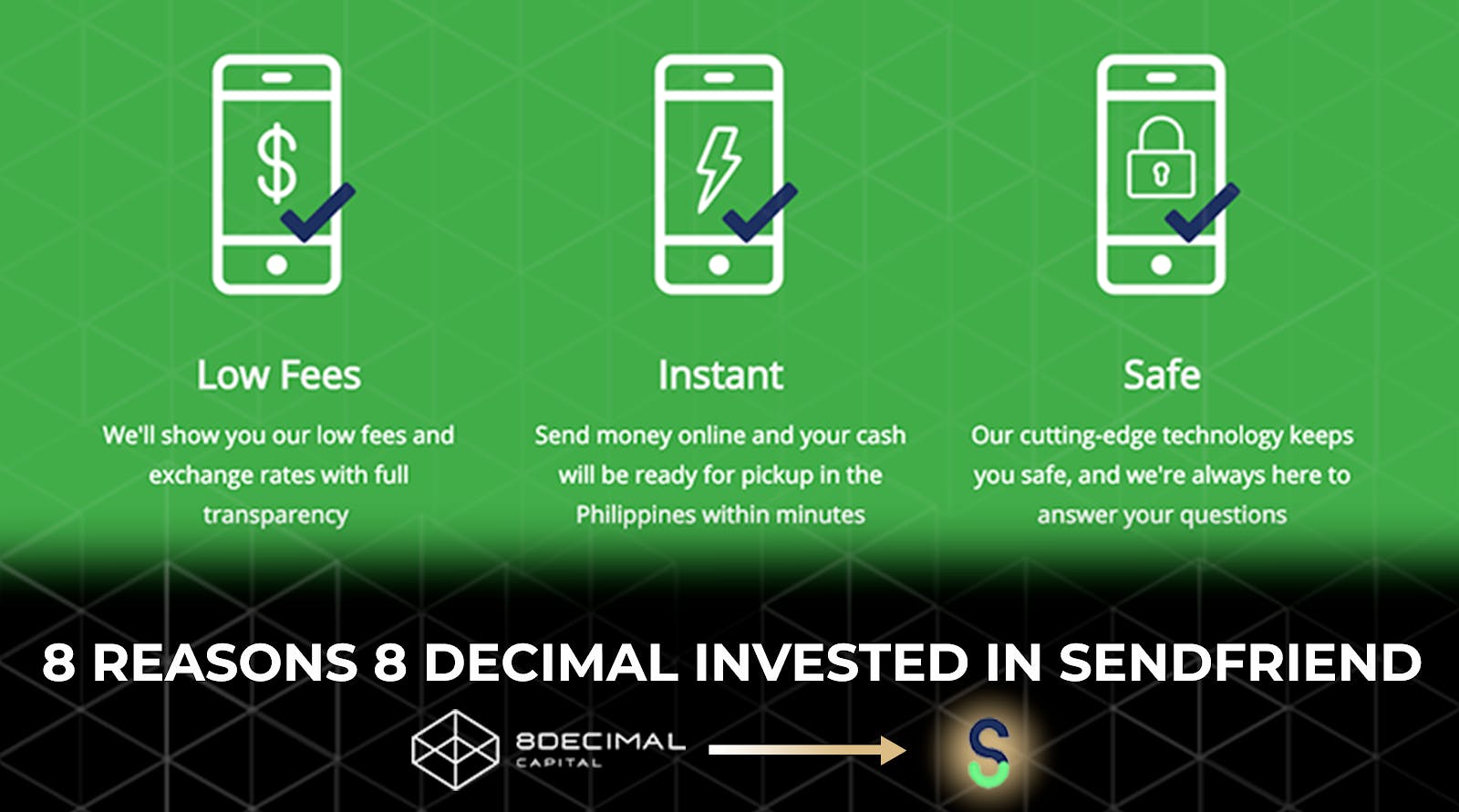 By: Kadeem Clarke, Investment Manager Team SendFriend has a strong team for many reasons. The CEO, David Lighton, has a strong background in the remittance space based on his financial inclusion work for the World Bank in Haiti and blockchain experience from MIT Media Lab paired with an understanding of the complex legal environment associated with the space. Joel Kosloski, the CTO, has 13 years of experience within the remittance space at multiple companies. Most recently, Joel served as Senior Director, Enterprise Architecture & Chief Enterprise Architect at MoneyGram (the second largest company in the payment remittances space). CRO David Anderson is leading the go-to-market efforts, having originally met David L. in class at Harvard Business School. Overall, the entire team has experience from a technology perspective in the remittance space as well as the industry in general. 2. Why Blockchain? SendFriend leverages blockchain technology to reduce the cost of global remittances for the millions of migrant workers who overpay for international money transfer as a result of friction in the banking system. Current incumbents, such as Western Union, Xoom, MoneyGram, and Remitly, all use a combination of SWIFT, correspondent banks and foreign exchange houses for international FX transfers. Instead, SendFriend uses blockchain. SendFriend sends money quicker and cheaper than its competitors. SendFriend has recently partnered with Ripple for the US-Philippines corridor, along with a partnership with Coins.ph for distribution. Blockchain offers superior speed and transparency for the processing of international payments and SendFriend will be the first US company to bring this benefit to consumers in a compliant fashion. 3. Timing Oftentimes, businesses in the blockchain space struggle with timing. If current technology is not fully developed to support their application, then the business won’t be successful. However, the timing for SendFriend is right, all of the infrastructure to conduct remittances using blockchain is already developed. 4. Other Investors SendFriend will benefit from the network effects produced by their two most notable supporters, the Barclays Accelerator powered by Techstars and Ripple. SendFriend was among 10 startups selected from over 750 applicants for the Barclays Accelerator powered by Techstars program, during which SendFriend was able to secure funding. Not only is SendFriend the only US-Philippines launch partner for Ripple’s xRapid, but Ripple is supporting SendFriend’s go-to-market efforts in the form of a $1 million incentive. 8 Decimal intends to provide SendFriend with advice, potential partnerships, and access to a wide network in the US and Asia as SendFriend’s business expands. Additionally, we will provide consultation and support for marketing and community outreach. Other notable investors include 2020 Ventures (an investor in Chain, Circle, and Ripple), Lytical Ventures, and angel investors. 5. Valuation We can’t go into too much detail about this, but the price is right. 6. Unicorn Potential In order to become a unicorn, a company must have a sustainable business model, that generates multiple streams of cash flow, operating in a large market. We firmly believe that SendFriend demonstrates these characteristics. They have a good combination of an experienced team, large $650 billion remittance market, and investors that provide more than just capital. SendFriend’s growth strategy is focused on revenue from transactions, APIs, and white-label solutions. 7. Marketing Strategy Their integrated marketing approach will reach consumers already sending money online, and consumers who currently send cash only, offline. This will be done by accessing tight-knit Filipino communities through grassroots campaigns, events, co-branding, and partnerships. 8. Competition This is a highly competitive space with longtime incumbents. However, SendFriend has built strong partnerships along its supply chain, while developing a foundation to significantly minimize friction in the system. SendFriend’s size could prove to be an asset as the incumbents will have a hard time following since they risk self-disruption and high switching costs. It is important to note that this is such a large market that there can be multiple winners. For example, 1% of just the US-PHP corridor would represent $400 million being transferred. 8 Decimal Capital: Shape the Blockchain Future | | | | Medium LinkedIn Twitter Facebook Website Email: contact@8dcapital.com if you have any more questions about this topic. 8 DECIMAL CAPITAL is a multi-strategy investment firm focusing on token and equity investments. 8 Decimal currently has more than 40 portfolio companies with an AUM of 60M USD. The investment team consists of more than 10 venture capital veterans, researchers, and trading professionals. The advisory board comprises Fan Zhang (Former Founding Partner of Sequoia Capital China), Karen Chen (Former CEO of UBS China) and Ben Bartlett (Vice Mayor of Berkeley). Based on the professional fund index ranking agency Token Metrics , 8 Decimal was ranked second out of the 51 active crypto funds. 8 Decimal is also well-received in China, named one of the top 10 funds in the blockchain industry by both 36氪(36Kr.com) , Chain Capture , and Odaily , as well as named one of the top 20 funds by Tsinghua X-Lab and Youth Education Chain League.